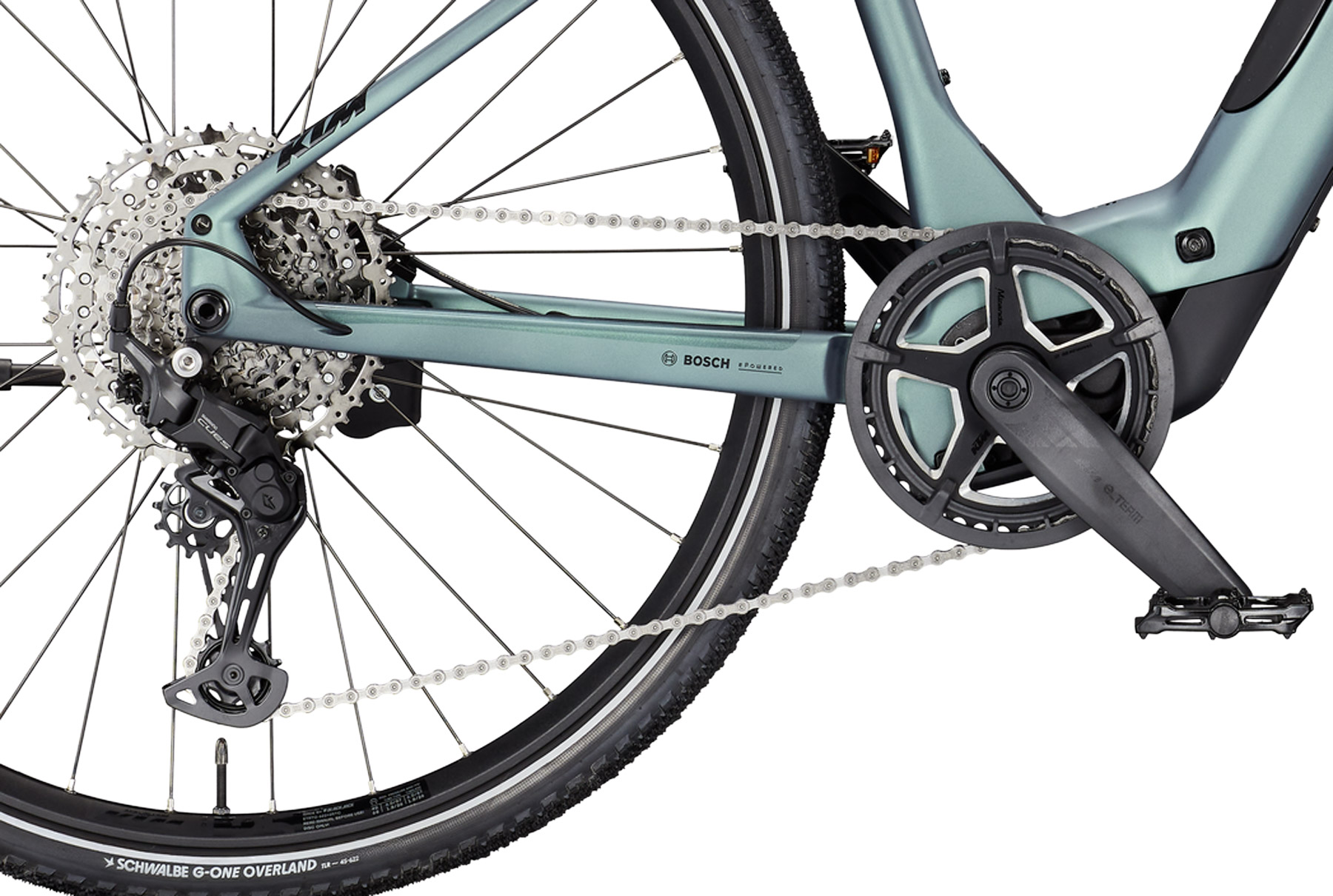 Als Bereifung für das KTM Macina Cross SX Elite wurde der für Gravelbikes besonders gut geeignete Schwalbe G-One Bite TLE gewählt, welcher idealen Einsatz für Straße aber auch Offroad bietet und mit hoher Haltbarkeit und sehr guter Kurvenhaftung punktet. Fühlt sich der G-One Bite auf der Straße schon gut an, spielt er abseits der befestigten Wege seine wahre Stärke aus. G-One Bite ist eindeutig im Gelände zuhause. Der Reifen rollt leicht und vibrationsarm, greift aber sicher und zuverlässig auf Schotterwegen sowie leichten, trockenen Trails.
