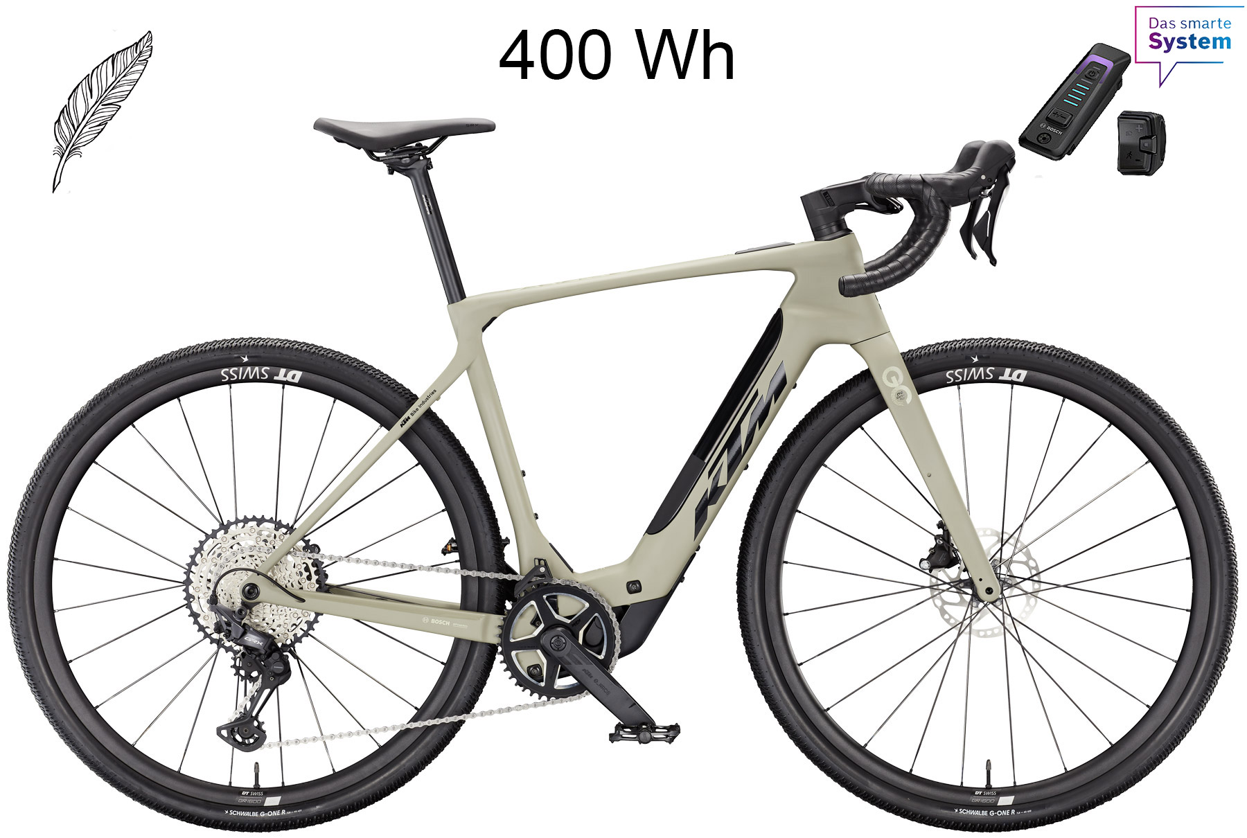 Der premium Carbonrahmen und die Carbongabel des KTM Macina Gravelator SX Elite sind vom Feinsten. Das geringe Gewicht des KTM Macina Gravelator SX Elite wirkt sich positiv auf die Reichweite aus, bis ca. 150 km sind gut möglich, der gewichtsoptimierte BOSCH SX Mittelmotor mit 55 Nm sorgt bei erhöhter Trittfrequenz für Spitzenleistungen von bis zu 600 W und bietet dieselbe Nenndauerleistung von 250 W wie der BOSCH CX Motor, 12 Gänge mit dem neuen Shimano GRX Antrieb sorgen für absolut saubere Schaltvorgänge.